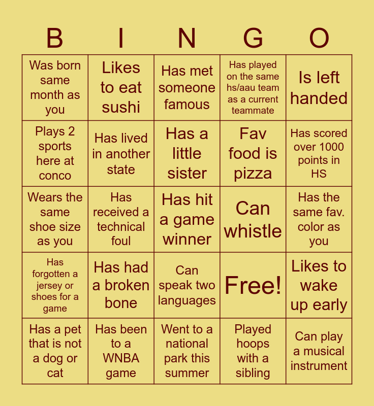 This bingo card has 25 words: Has had a broken bone, Went to a national park this summer, Has a little sister, Has a pet that is not a dog or cat, Is left handed, Was born same month as you, Plays 2 sports here at conco, Likes to eat sushi, Can whistle, Can speak two languages, Fav food is pizza, Wears the same shoe size as you, Free!, Likes to wake up early, Has lived in another state, Can play a musical instrument, Has the same fav. color as you, Has met someone famous, Has scored over 1000 points in HS, Has received a technical foul, Has hit a game winner, Has been to a WNBA game, Has forgotten a jersey or shoes for a game, Has played on the same hs/aau team as a current teammate and Played hoops with a sibling.
