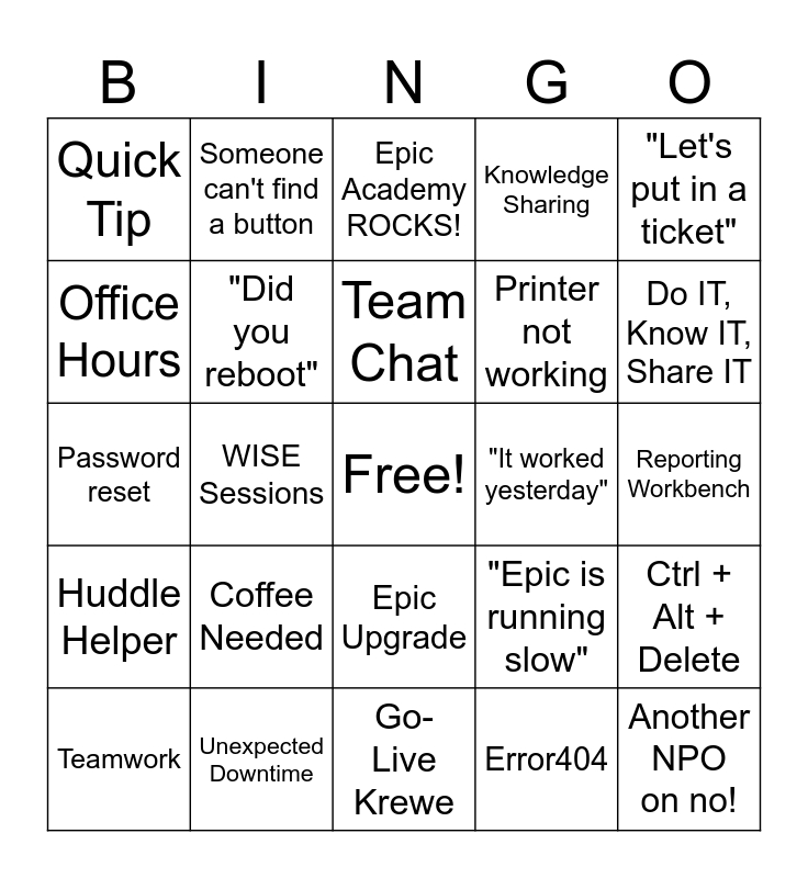 This bingo card has a free space and 24 words: Coffee Needed, Unexpected Downtime, Team Chat, Teamwork, "Let's put in a ticket", Quick Tip, Office Hours, Someone can't find a button, "It worked yesterday", Epic Upgrade, Printer not working, Password reset, "Epic is running slow", Ctrl + Alt + Delete, "Did you reboot", Error404, Reporting Workbench, Epic Academy ROCKS!, Do IT, Know IT, Share IT, WISE Sessions, Another NPO on no!, Huddle Helper, Knowledge Sharing and Go-Live Krewe.