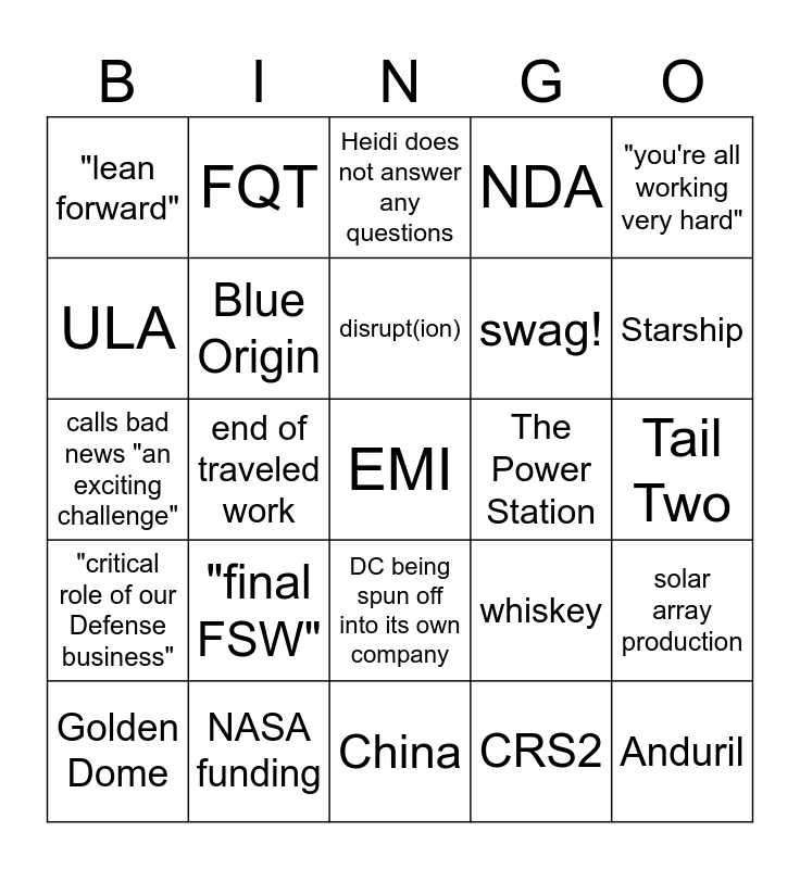 This bingo card has a free space and 35 words: no more sparkling water, IPO, SNC, Blue Origin, DC being spun off into its own company, NDA, ULA, sub-letting Eldo, disrupt(ion), "the investors trust us so much", calls bad news "an exciting challenge", "you're all working very hard", ULA, wing deploy, "lean forward", The Power Station, CRS2, end of traveled work, "critical role of our Defense business", Anduril, whiskey, Golden Dome, solar array production, NASA funding, Heidi does not answer any questions, Starship, hot dogs, pet competition, swag!, Tail Two, Russia, China, "final FSW", FQT and day-in-the-life.