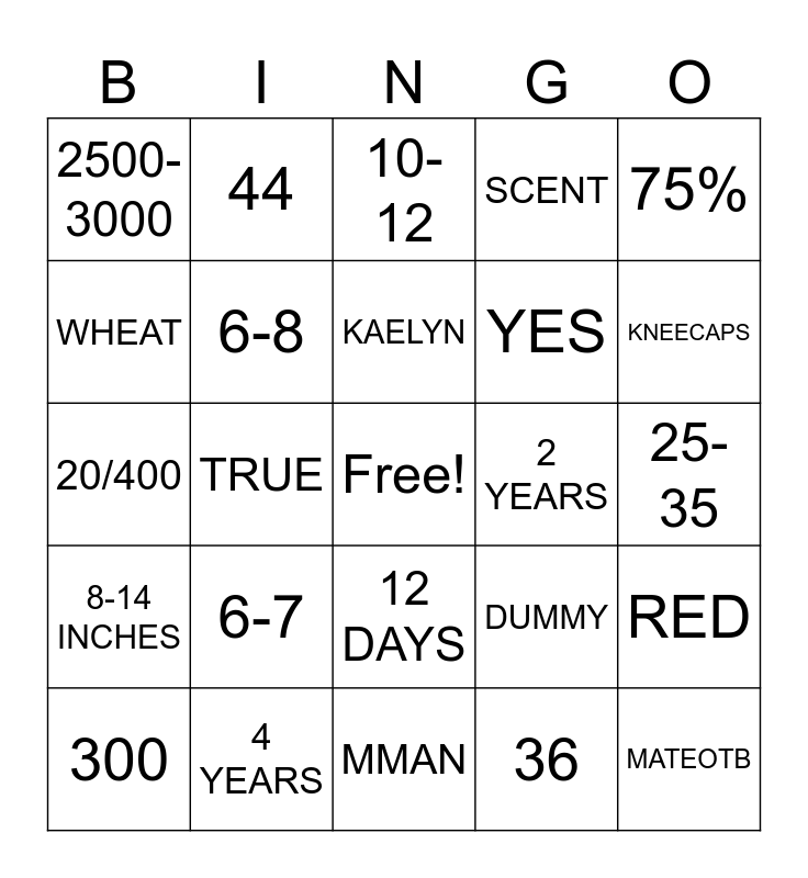 This bingo card has a free space and 29 words: 300, 69, TRUE, FALSE, 2500-3000, 10-12, 6-8, 6-7, 2 YEARS, 4 YEARS, 25-35, MATEOTB, MMAN, 36, KNEECAPS, CHERRY, 12 DAYS, 8-14 INCHES, 75%, 20/400, DUMMY, PINEAPPLE, YES, WHEAT, SCENT, 44, RED, KAELYN and CORY.