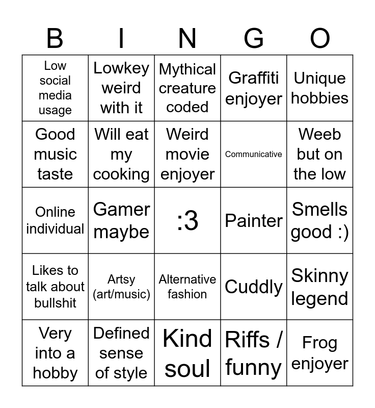 This bingo card has a free space and 24 words: Artsy (art/music), Defined sense of style, Weird movie enjoyer, Very into a hobby, Unique hobbies, Low social media usage, Good music taste, Lowkey weird with it, Painter, Alternative fashion, Communicative, Online individual, Cuddly, Skinny legend, Will eat my cooking, Riffs / funny, Smells good :), Mythical creature coded, Weeb but on the low, Gamer maybe, Frog enjoyer, Likes to talk about bullshit, Graffiti enjoyer and Kind soul.