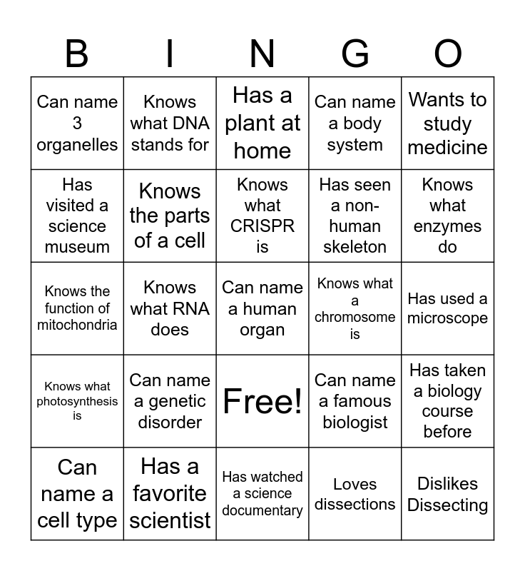 This bingo card has 26 words: Free!, Loves dissections, Knows what CRISPR is, Has a favorite scientist, Wants to study medicine, Can name 3 organelles, Has visited a science museum, Knows what DNA stands for, Has used a microscope, Can name a famous biologist, Has seen a non-human skeleton, Knows the function of mitochondria, Has taken a biology course before, Can name a cell type, Knows what RNA does, Has read a science article recently, Can name a body system, Knows what photosynthesis is, Has a plant at home, Can name a human organ, Knows what enzymes do, Has watched a science documentary, Knows what a chromosome is, Can name a genetic disorder, Knows the parts of a cell and Dislikes Dissecting.