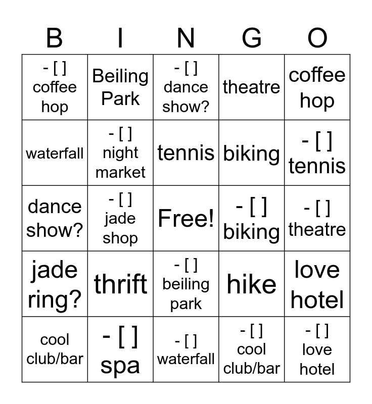 This bingo card has a free space and 30 words: - [ ] spa, - [ ] hike, - [ ] jade shop, - [ ] thrift, - [ ] coffee hop, - [ ] dance show?, - [ ] night market, - [ ] beiling park, - [ ] biking, - [ ] waterfall, - [ ] theatre, - [ ] love hotel, - [ ] cool club/bar, - [ ] shopping ?, - [ ] tennis, spa, hike, jade ring?, thrift, coffee hop, dance show?, night market, Beiling Park, biking, waterfall, theatre, love hotel, cool club/bar, tennis and run.