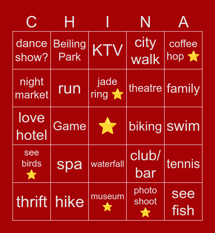 This bingo card has a free space and 24 words: spa, hike, jade ring ⭐, thrift, coffee hop ⭐, dance show?, night market, Beiling Park, biking, waterfall, theatre, love hotel, club/ bar, tennis, run, photo shoot ⭐, swim, KTV, family, Game, see fish, see birds ⭐, city walk and museum ⭐.