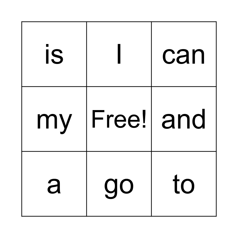 This bingo card has a free space and 14 words: see, the, a, I, my, to, am, at, go, is, no, and, can and you.