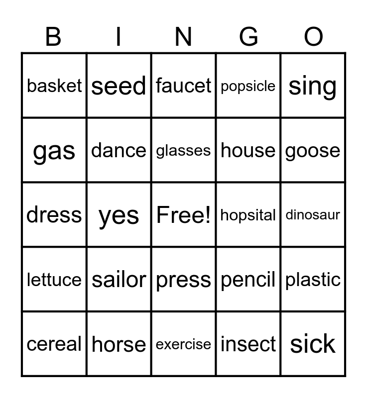 This bingo card has a free space and 24 words: cereal, sailor, glasses, insect, sing, basket, seed, faucet, hopsital, dinosaur, dress, dance, pencil, plastic, gas, horse, exercise, popsicle, goose, lettuce, yes, press, house and sick.