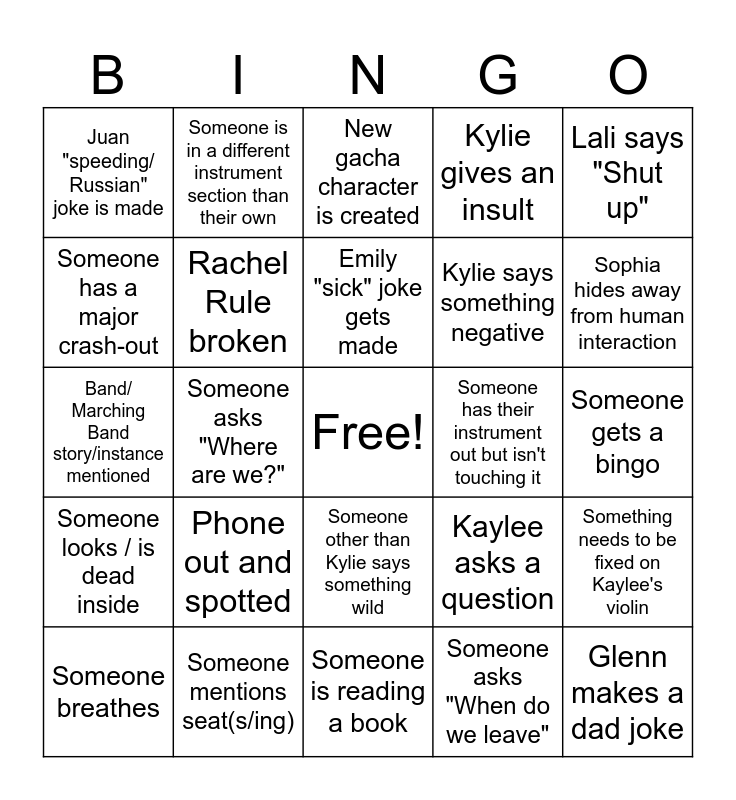 This bingo card has a free space and 49 words: Glenn mentions bow usage, Glenn makes a dad joke, Kylie says something out of pocket, Someone is reading a book, Phone out and spotted, Someone is sleeping, Someone is in a different instrument section than their own, Lali says "Shut the freak up", Someone has a major crash-out, Someone says moist or something with it, Rachel Rule broken, Kylie gives an insult, Something needs to be fixed on Kaylee's violin, Kaylee asks a question, Imani makes her flabbergasted speechless face, Kylie grabs sheet music from cabinet, Emily "sick" joke gets made, Someone has their instrument out but isn't touching it, Kylie, Imani, or Rachel crash out, Lali says "Shut up", Someone asks "Where are we?", Someone asks "When do we leave", Juan "speeding/ Russian" joke is made, Kylie says something negative, Someone finds a duck, Sophia hides away from human interaction, Someone breathes, Juan isn't where he's supposed to be, Someone other than Kylie says something wild, Someone looks / is dead inside, Stand doesn't get put away, Chair doesn't get put away, Someone out of tune mid playing, Lali crashes out over "moist", Someone mentions seat(s/ing), Someone is rushing or too slow, Existential crisis, Someone mentions/ is singing K-Pop Demon Hunters or one of their songs, Someone gets a bingo, Someone is 'caressing' someone else's...anything, Someone other thank Kylie is a Negative Nettie, Communist bathroom break, Theory Thursday derailed, Theory Thursday crash-out(s), Band/ Marching Band story/instance mentioned, New gacha character is created, Slater adds a new figurine, Someone gets a blackout(bingo) and Kylie asks to play all the way through to the end.