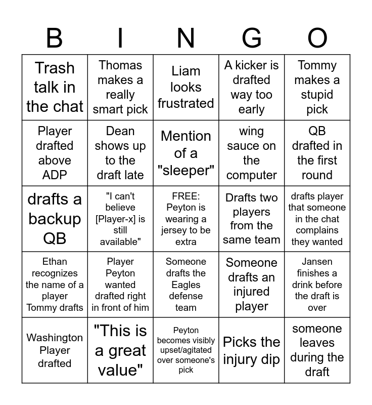 This bingo card has a free space and 24 words: Player Peyton wanted drafted right in front of him, "This is a great value", Mention of a "sleeper", Washington Player drafted, Tommy makes a stupid pick, Trash talk in the chat, Player drafted above ADP, Thomas makes a really smart pick, Drafts two players from the same team, Someone drafts the Eagles defense team, wing sauce on the computer, drafts a backup QB, Someone drafts an injured player, Jansen finishes a drink before the draft is over, Dean shows up to the draft late, Picks the injury dip, drafts player that someone in the chat complains they wanted, Liam looks frustrated, QB drafted in the first round, "I can't believe [Player-x] is still available", someone leaves during the draft, Ethan recognizes the name of a player Tommy drafts, A kicker is drafted way too early and Peyton becomes visibly upset/agitated over someone's pick.