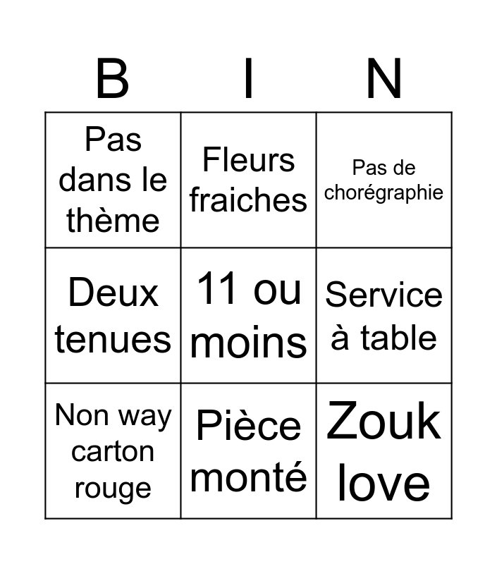 This bingo card has a free space and 8 words: Service à table, Pas de chorégraphie, Fleurs fraiches, Non way carton rouge, Pas dans le thème, Zouk love, Deux tenues and Pièce monté.
