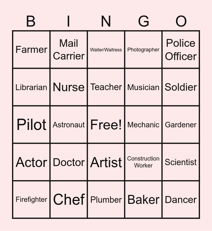 This bingo card has a free space and 24 words: Doctor, Chef, Teacher, Firefighter, Police Officer, Farmer, Librarian, Mail Carrier, Mechanic, Artist, Musician, Pilot, Construction Worker, Scientist, Nurse, Baker, Gardener, Waiter/Waitress, Soldier, Astronaut, Dancer, Actor, Photographer and Plumber.