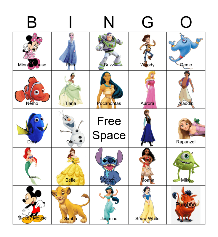 This bingo card has 29 images, a free space and 29 words: Mickey Mouse, Winnie the Pooh, Olaf, Miguel, Minnie Mouse, Buzz, Tiana, Belle, Anna, Simba, Rapunzel, Pumbaa, Jasmine, Snow White, Aladdin, Mulan, Stitch, Ariel, Genie, Dory, Moana, Cinderella, Aurora, Nemo, Woody, Elsa, Mike, Pocahontas and Joy.