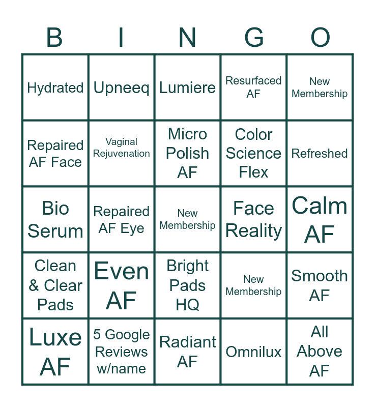 This bingo card has 25 words: Even AF, Radiant AF, Micro Polish AF, Luxe AF, New Membership, Hydrated, Repaired AF Face, Upneeq, Face Reality, Bright Pads HQ, Color Science Flex, Bio Serum, New Membership, Smooth AF, Vaginal Rejuvenation, All Above AF, Calm AF, Lumiere, Refreshed, Repaired AF Eye, New Membership, 5 Google Reviews w/name, Clean & Clear Pads, Resurfaced AF and Omnilux.
