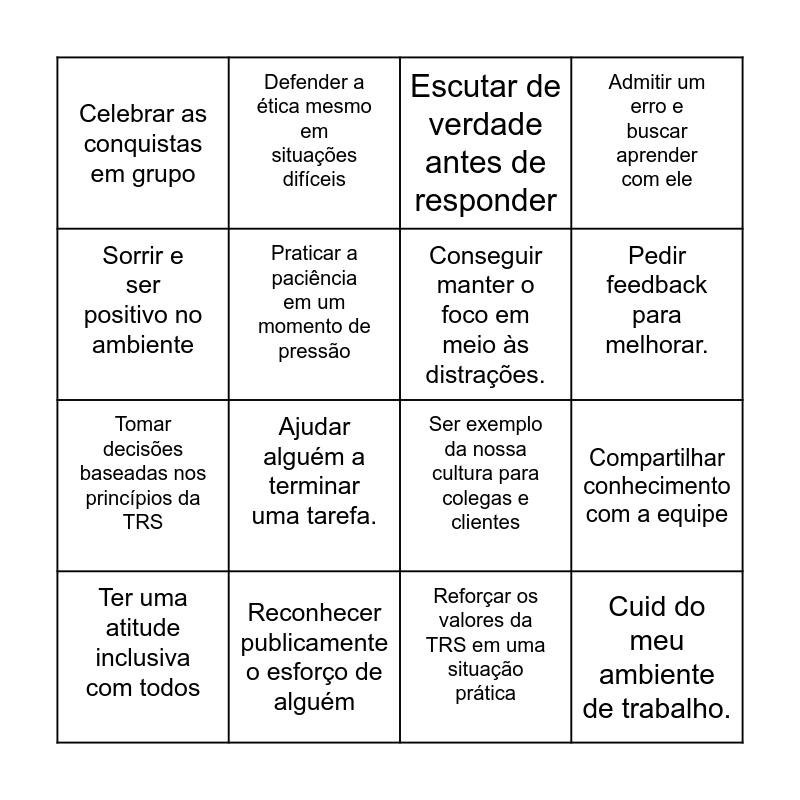 This bingo card has 16 words: Reconhecer publicamente o esforço de alguém, Compartilhar conhecimento com a equipe, Escutar de verdade antes de responder, Celebrar as conquistas em grupo, Tomar decisões baseadas nos princípios da TRS, Defender a ética mesmo em situações difíceis, Ser exemplo da nossa cultura para colegas e clientes, Reforçar os valores da TRS em uma situação prática, Sorrir e ser positivo no ambiente, Praticar a paciência em um momento de pressão, Ter uma atitude inclusiva com todos, Admitir um erro e buscar aprender com ele, Ajudar alguém a terminar uma tarefa., Pedir feedback para melhorar., Conseguir manter o foco em meio às distrações. and Cuid do meu ambiente de trabalho..