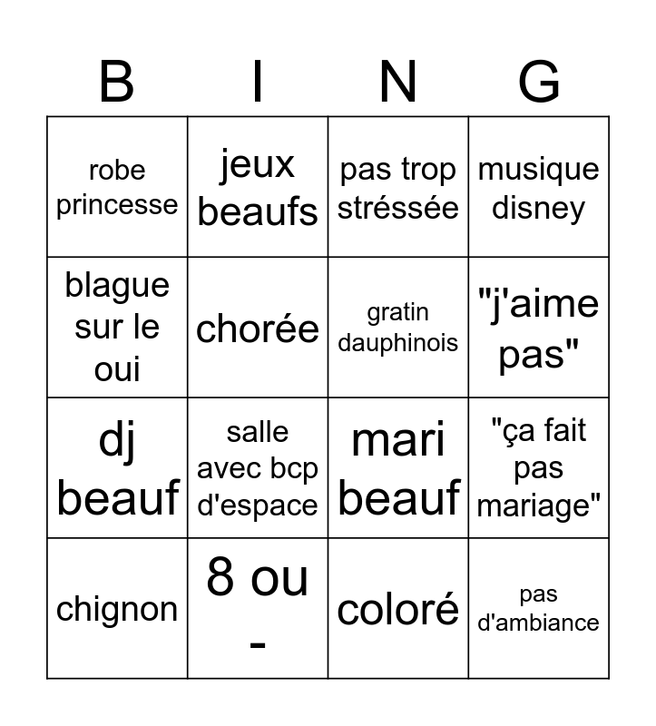 This bingo card has 16 words: 8 ou -, "ça fait pas mariage", pas trop stréssée, robe princesse, dj beauf, jeux beaufs, mari beauf, coloré, blague sur le oui, chorée, chignon, musique disney, salle avec bcp d'espace, "j'aime pas", gratin dauphinois and pas d'ambiance.