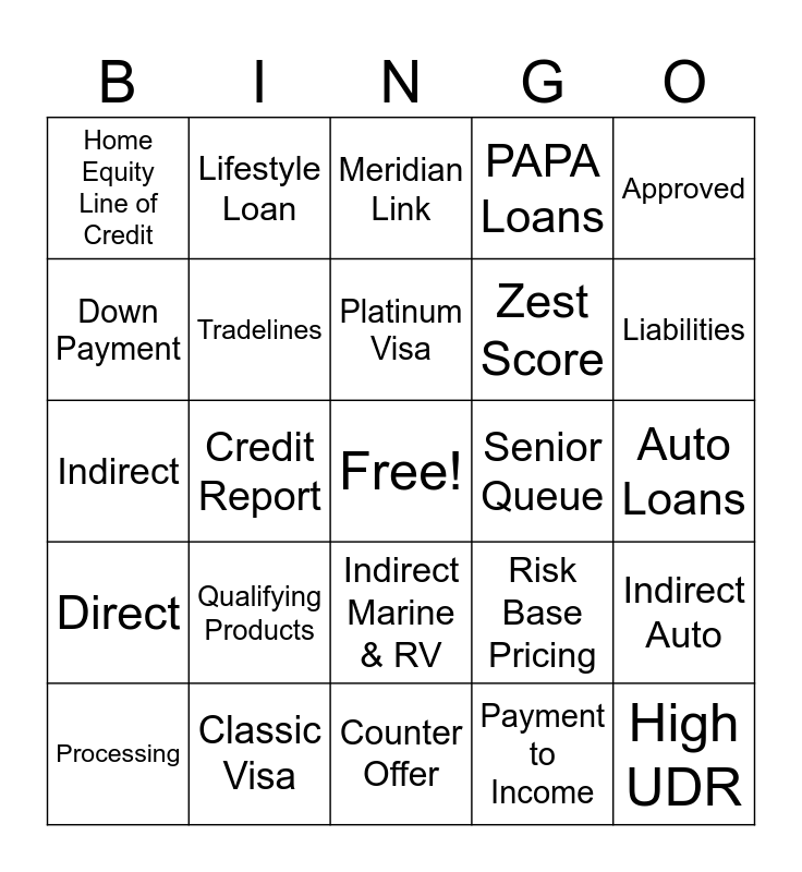 This bingo card has a free space and 29 words: Processing, Excessive Obligations, Credit Report, Declined, Home Equity Line of Credit, Meridian Link, Tradelines, Qualifying Products, Senior Queue, Classic Visa, Auto Loans, High UDR, Counter Offer, Payment to Income, Liabilities, High DTI, Indirect Marine & RV, Direct, Approved, Indirect, Risk Base Pricing, Dealers, Zest Score, Down Payment, PAPA Loans, Lifestyle Loan, Indirect Auto, Platinum Visa and Underwriting Team.