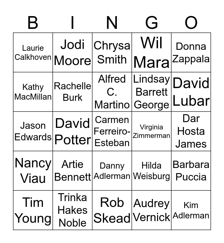 This bingo card has 42 words: Free!, Alfred C. Martino, Alison Ashley Formento, Artie Bennett, Audrey Vernick, Barbara Puccia, Carmen Ferreiro-Esteban, Charlotte Bennardo, Chrysa Smith, Danny Adlerman, Dar Hosta James, David Lubar, David Potter, Donna Zappala, Gwyn English Nielsen, Hilda Weisburg, Jan Cheripko, Jason Edwards, Jason J. Marchi, Jodi Moore, Kathy MacMillan, Kerry Gans, Kim Adlerman, Laurie Calkhoven, Laurie Wallmark, Lee Harper, Lindsay Barrett George, Lisa Colozza Cocca, Marcie Aboff, Melanie Conklin, Michael Markman, Nancy Viau, Rachelle Burk, Rob Skead, Skylar Beecher, Tim Young, Trinka Hakes Noble, Virginia Zimmerman, Wendy Decker, Wendy Mass, Wil Mara and Yvonne Ventresca.