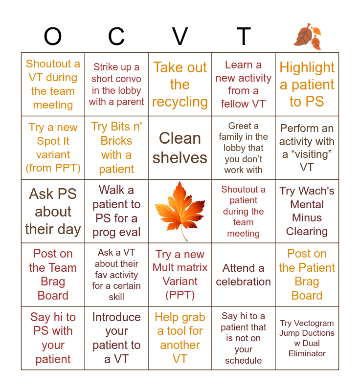 This bingo card has a free space and 24 words: Say hi to PS with your patient, Ask a VT about their fav activity for a certain skill, Clean shelves, Say hi to a patient that is not on your schedule, Highlight a patient to PS, Shoutout a VT during the team meeting, Strike up a short convo in the lobby with a parent, Take out the recycling, Shoutout a patient during the team meeting, Try Wach's Mental Minus Clearing, Ask PS about their day, Try Bits n' Bricks with a patient, Attend a celebration, Post on the Patient Brag Board, Try a new Spot It variant (from PPT), Introduce your patient to a VT, Help grab a tool for another VT, Learn a new activity from a fellow VT, Perform an activity with a βvisitingβ VT, Post on the Team Brag Board, Walk a patient to PS for a prog eval, Try a new Mult matrix Variant (PPT), Greet a family in the lobby that you donβt work with and Try Vectogram Jump Ductions w Dual Eliminator.