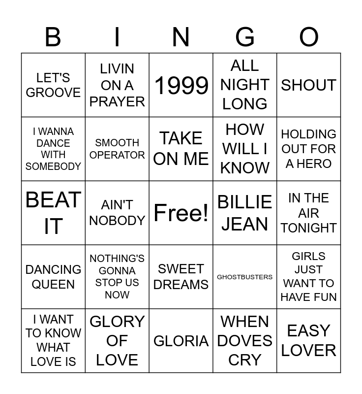 This bingo card has a free space and 67 words: AFRICA, DON'T STOP BELIEVIN, TRUE, GIRLS JUST WANT TO HAVE FUN, BROKEN WINGS, EVERYBODY WANTS TO RULE THE WORLD, LIVIN ON A PRAYER, EVERY BREATH YOU TAKE, TAKE ON ME, TIME AFTER TIME, SWEET DREAMS, SEPTEMBER, IN THE AIR TONIGHT, SHOUT, RHYTHM OF THE NIGHT, I WANNA DANCE WITH SOMEBODY, AIN'T NOBODY, LET'S GROOVE, DON'T YOU WANT ME, HOW WILL I KNOW, NOTHING'S GONNA STOP US NOW, DANCING QUEEN, ALL NIGHT LONG, WHEN DOVES CRY, WHO CAN IT BE NOW, WHAT'S LOVE GOT TO DO WITH IT, SUSSUDIO, NEVER GONNA GIVE YOU UP, HOLDING OUT FOR A HERO, I WILL SURVIVE, EASY LOVER, LOVE SHACK, STAYIN ALIVE, FOOTLOOSE, ROCK WITH YOU, I WANT TO KNOW WHAT LOVE IS, YOU SHOOK ME ALL NIGHT LONG, GHOSTBUSTERS, BEAT IT, PARTY ALL THE TIME, KISS, SMOOTH OPERATOR, BILLIE JEAN, CAN'T FIGHT THIS FEELING, YOU GIVE LOVE A BAD NAME, JANIE'S GOT A GUN, DANCING IN THE STREET, GLORY OF LOVE, HEART OF GLASS, GIVE ME THE NIGHT, 1999, I CAN'T GO FOR THAT, RAPTURE, SWEET CHILD O'MINE, THE GLAMOROUS LIFE, GLORIA, YOU CAN CALL ME AL, YOUR LOVE, CARIBBEAN QUEEN, I KEEP FORGETTING, COOL IT NOW, TAKE MY BREATH AWAY, SEXUAL HEALING, THE BEST, BAD, DANGER ZONE and BORN IN THE USA.