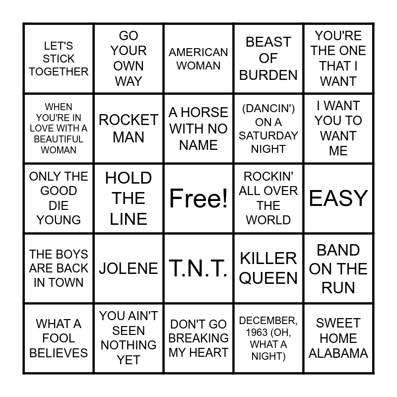 This bingo card has a free space and 48 words: SULTANS OF SWING, SWEET HOME ALABAMA, SON OF MY FATHER, DON'T GO BREAKING MY HEART, JOLENE, LET YOUR LOVE FLOW, GO YOUR OWN WAY, HAVE YOU EVER SEEN THE RAIN, WHEN YOU'RE IN LOVE WITH A BEAUTIFUL WOMAN, BREAKFAST IN AMERICA, ROCKET MAN, BEAST OF BURDEN, BAND ON THE RUN, KILLER QUEEN, CECILIA, ROXANNE, A HORSE WITH NO NAME, ROCKIN' ALL OVER THE WORLD, I LOVE THE NIGHTLIFE, YOU'RE THE ONE THAT I WANT, HOLD THE LINE, DECEMBER, 1963 (OH, WHAT A NIGHT), LET'S STICK TOGETHER, (DANCIN') ON A SATURDAY NIGHT, MY SWEET LORD, I WANT YOU TO WANT ME, WHAT A FOOL BELIEVES, IF YOU LEAVE ME NOW, T.N.T., THE BOYS ARE BACK IN TOWN, IT NEVER RAINS IN SOUTHERN CALIFORNIA, MORE THAN A FEELING, LIFE IN THE FAST LANE, ROCK WITH YOU, YOU AIN'T SEEN NOTHING YET, MY SHARONA, IS THIS LOVE, EASY, BOOGIE WONDERLAND, WILD NIGHT, OYE COMO VA, HOTEL CALIFORNIA, AMERICAN WOMAN, LET'S GET IT ON, ONLY THE GOOD DIE YOUNG, YOU SEXY THING, LIVE AND LET DIE and YOU'RE SO VAIN.