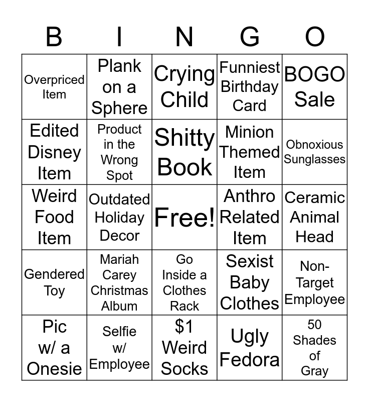 This bingo card has a free space and 24 words: Mariah Carey Christmas Album, Selfie w/ Employee, Shitty Book, Pic w/ a Onesie, BOGO Sale, Overpriced Item, Edited Disney Item, Plank on a Sphere, Anthro Related Item, Go Inside a Clothes Rack, Minion Themed Item, Weird Food Item, Sexist Baby Clothes, Non-Target Employee, Product in the Wrong Spot, Ugly Fedora, Ceramic Animal Head, Crying Child, Obnoxious Sunglasses, Outdated Holiday Decor, 50 Shades of Gray, Gendered Toy, Funniest Birthday Card and $1 Weird Socks.