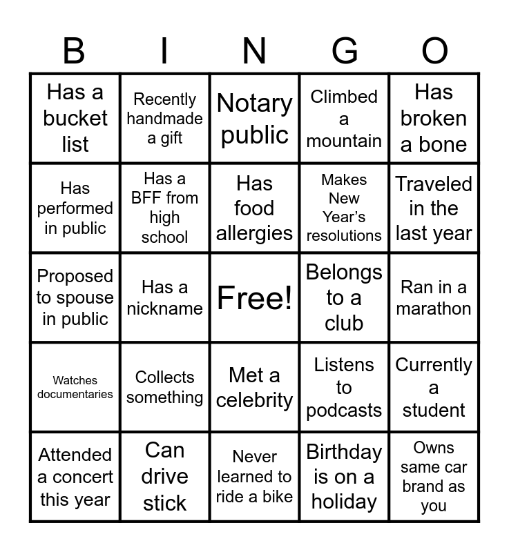 This bingo card has a free space and 52 words: Same birth month as you, Owns same car brand as you, Never flown on an airplane, Never learned to ride a bike, Collects something, Goes all-out on holiday decorating, Recently handmade a gift, Received an award, Has performed in public, Has a phobia, Has a BFF from high school, Fostered or adopted a child, Currently a student, Listens to podcasts, Travels often, Attended high school reunion, Has food allergies, Belongs to a club, Named after a relative, Has broken a bone, Has a nickname, Birthday is on a holiday, Has a bucket list, Makes New Year’s resolutions, Taught a class, Worked at a family business, Visited 4+ continents, Speaks 2+ languages, Traveled in the last year, Can do basic car repairs, Invests in the stock market, Climbed a mountain, Moved in the past year, Owns a boat, Has a big backyard, Notary public, Can drive stick, Owns a vacation house, Started a business, Has been in a hot air balloon, Has taken a cruise, Ran in a marathon, Watches documentaries, Brews beer, Met a celebrity, Likes pineapple on pizza, Been on a bad blind date, Proposed to spouse in public, Been to Disney World, Loves roller coasters, Attended a concert this year and Sends Christmas cards.