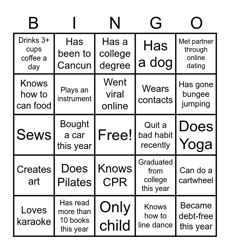 This bingo card has a free space and 55 words: Screams during scary movies, Loves karaoke, Has been skydiving, Drinks 3+ cups coffee a day, Only child, Twin or triplet, Plays an instrument, Volunteers regularly, Wears contacts, Has a cat, Has a dog, Has an exotic pet, Has an unusual hobby, Has a tattoo, Is left-handed, Double-jointed, Met partner through online dating, Bought a car this year, Bought a house this year, Became debt-free this year, Quit a bad habit recently, Has a Masters or PhD, Graduated from college this year, Has a college degree, Knows ASL, Went viral online, Knows how to line dance, Loves true crime podcasts, Does Yoga, Can do a cartwheel, Rides horses, Knows martial arts, Reads newspapers, Reads magazines, Knows how to can food, Sews, Uses a paper planner, Creates art, Has only one sibling, Has been to Las Vegas, Has been to Cancun, Has been to Puerto Rico, Has been to California, Likes guacamole, Does Pilates, Has read more than 10 books this year, Has never broken a bone, Has gone on a solo trip, Has never learned to swim, Has gone bungee jumping, Has gone zip lining, Is a doctor, Is a nurse, Knows CPR and Is an educator.