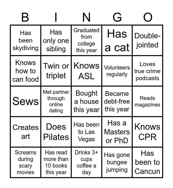 This bingo card has 56 words: Free!, Screams during scary movies, Loves karaoke, Has been skydiving, Drinks 3+ cups coffee a day, Only child, Twin or triplet, Plays an instrument, Volunteers regularly, Wears contacts, Has a cat, Has a dog, Has an exotic pet, Has an unusual hobby, Has a tattoo, Is left-handed, Double-jointed, Met partner through online dating, Bought a car this year, Bought a house this year, Became debt-free this year, Quit a bad habit recently, Has a Masters or PhD, Graduated from college this year, Has a college degree, Knows ASL, Went viral online, Knows how to line dance, Loves true crime podcasts, Does Yoga, Can do a cartwheel, Rides horses, Knows martial arts, Reads newspapers, Reads magazines, Knows how to can food, Sews, Uses a paper planner, Creates art, Has only one sibling, Has been to Las Vegas, Has been to Cancun, Has been to Puerto Rico, Has been to California, Likes guacamole, Does Pilates, Has read more than 10 books this year, Has never broken a bone, Has gone on a solo trip, Has never learned to swim, Has gone bungee jumping, Has gone zip lining, Is a doctor, Is a nurse, Knows CPR and Is an educator.