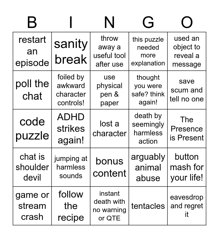 This bingo card has a free space and 37 words: >15 minutes on a simple puzzle, voice actor acted too little, voice actor acted too much, foiled by awkward character controls!, button mash for your life!, jumping at harmless sounds, use physical pen & paper, easter egg revealed!, used an object to reveal a message, carried object forever before realizing its use, ADHD strikes again!, this puzzle needed more explanation, eavesdrop and regret it, The Presence is Present, poll the chat, chat is shoulder devil, chat is shoulder angel, throw away a useful tool after use, bonus content, death by seemingly harmless action, restart an episode, save scum and tell no one, game or stream crash, instant death with no warning or QTE, backtrack endlessly, tentacles, sanity break, RIP headphone users, RIP non-headphone users, fire is needed, solve a puzzle by accident or brute force, follow the recipe, code puzzle, it's a maze-ing, arguably animal abuse, thought you were safe? think again! and superchat over $50.