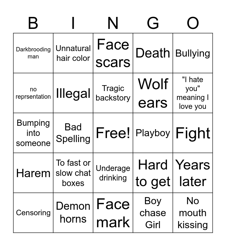 This bingo card has a free space and 24 words: To fast or slow chat boxes, Demon horns, Tragic backstory, Censoring, Bullying, Darkbrooding man, no reprsentation, Unnatural hair color, Playboy, Underage drinking, Wolf ears, Bumping into someone, Hard to get, Years later, Illegal, Boy chase Girl, Fight, Face scars, "I hate you" meaning I love you, Bad Spelling, No mouth kissing, Harem, Death and Face mark.