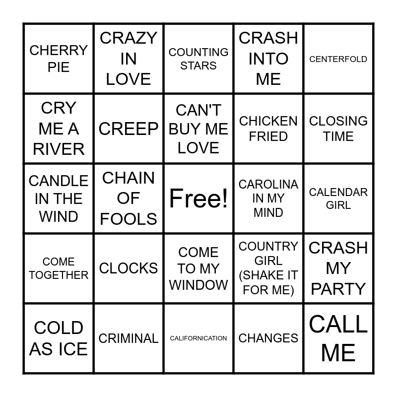 This bingo card has a free space and 48 words: CALIFORNIA GIRLS, CALL ME, CALL ME MAYBE, CALIFORNICATION, CLOCKS, CRUISE, CRAZY IN LOVE, CRASH AND BURN, CRY ME A RIVER, CRAZY, CREEP, CRASH INTO ME, CRASH MY PARTY, COUNTRY GIRL (SHAKE IT FOR ME), COME AS YOU ARE, COME ON EILEEN, CAN'T BUY ME LOVE, CAROLINA IN MY MIND, CARRY ON WAYWARD SON, CENTERFOLD, CHAIN OF FOOLS, CHANGES, CHERRY PIE, CHICKEN FRIED, CLOSE TO YOU, CLOSING TIME, COLD AS ICE, COME A LITTLE CLOSER, COME TO MY WINDOW, COME TOGETHER, COMFORTABLY NUMB, COMPLICATED, COPACABANA, CRADLE OF LOVE, CRIMINAL, CROCODILE ROCK, CUTS LIKE A KNIFE, CALENDAR GIRL, CARELESS WHISPER, CUPID, CRAZY TOWN, CRUSHIN' IT, COUNTING STARS, CAT SCRATCH FEVER, CANDLE IN THE WIND, CRAZY ON YOU, CAN'T HELP FALLING IN LOVE and CAROLINA.