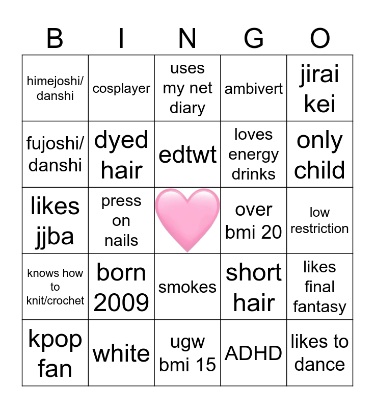 This bingo card has a free space and 24 words: born 2009, white, edtwt, kpop fan, jirai kei, himejoshi/ danshi, fujoshi/ danshi, cosplayer, over bmi 20, smokes, loves energy drinks, likes jjba, short hair, likes final fantasy, dyed hair, ADHD, low restriction, uses my net diary, only child, press on nails, likes to dance, knows how to knit/crochet, ambivert and ugw bmi 15.