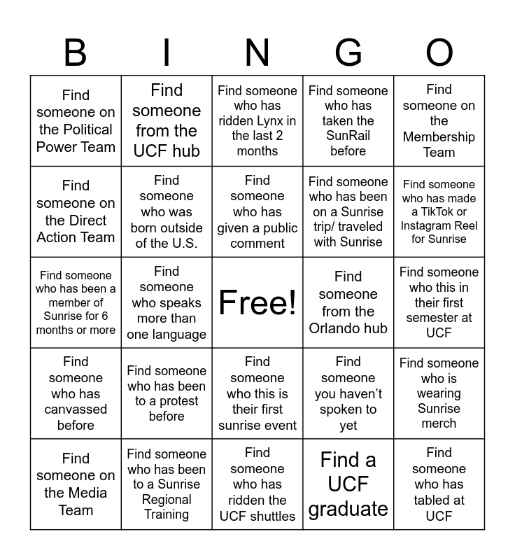 This bingo card has a free space and 24 words: Find someone who has been to a protest before, Find someone who has been to a Sunrise Regional Training, Find someone who has given a public comment, Find someone on the Media Team, Find someone on the Membership Team, Find someone on the Political Power Team, Find someone on the Direct Action Team, Find someone from the UCF hub, Find someone from the Orlando hub, Find someone who this is their first sunrise event, Find someone who has been on a Sunrise trip/ traveled with Sunrise, Find someone who has been a member of Sunrise for 6 months or more, Find someone you haven’t spoken to yet, Find someone who is wearing Sunrise merch, Find someone who was born outside of the U.S., Find a UCF graduate, Find someone who this in their first semester at UCF, Find someone who has ridden Lynx in the last 2 months, Find someone who has made a TikTok or Instagram Reel for Sunrise, Find someone who speaks more than one language, Find someone who has tabled at UCF, Find someone who has canvassed before, Find someone who has taken the SunRail before and Find someone who has ridden the UCF shuttles.