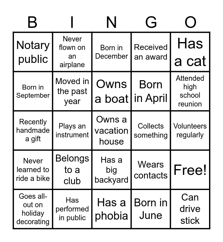 This bingo card has 28 words: Free!, Born in January, Born in April, Born in June, Born in September, Born in December, Never flown on an airplane, Never learned to ride a bike, Collects something, Goes all-out on holiday decorating, Recently handmade a gift, Received an award, Has performed in public, Has a phobia, Attended high school reunion, Has food allergies, Belongs to a club, Moved in the past year, Owns a boat, Has a big backyard, Notary public, Can drive stick, Owns a vacation house, Plays an instrument, Volunteers regularly, Wears contacts, Has a cat and Has a dog.