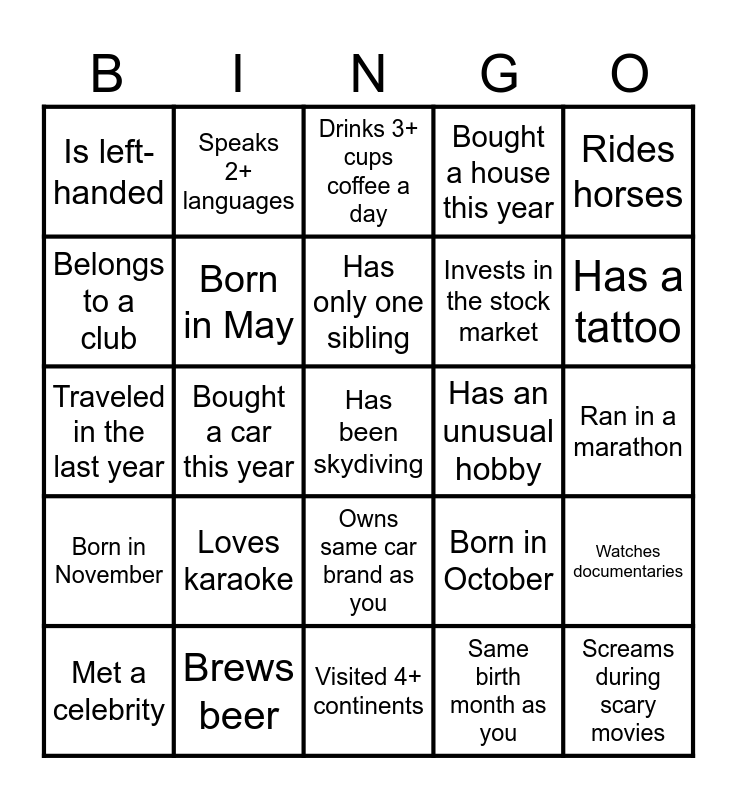 This bingo card has 36 words: Free!, Born in March, Born in April, Born in May, Born in October, Born in November, Has only one sibling, Has been to Las Vegas, Rides horses, Knows martial arts, Bought a car this year, Bought a house this year, Has an exotic pet, Has an unusual hobby, Has a tattoo, Is left-handed, Screams during scary movies, Loves karaoke, Has been skydiving, Drinks 3+ cups coffee a day, Ran in a marathon, Watches documentaries, Brews beer, Met a celebrity, Visited 4+ continents, Speaks 2+ languages, Traveled in the last year, Can do basic car repairs, Invests in the stock market, Belongs to a club, Named after a relative, Has broken a bone, Same birth month as you, Owns same car brand as you, Never flown on an airplane and Never learned to ride a bike.