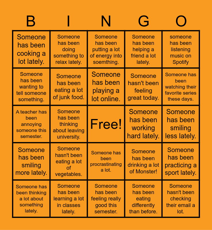 This bingo card has a free space and 28 words: Someone has been practicing a sport lately., Someone's friend has been preparing for a marathon., Someone hasn't been feeling great today., Someone has been eating differently than before., Someone has been wanting to tell someone something., Someone has been putting a lot of energy into soemthing., Someone has been doing something to relax lately., Someone has been smiling more lately., Someone has been working hard lately., Someone has been thinking a lot about something lately., A teacher has been annoying someone this semester., Someone has been helping a friend a lot lately., Someone has been learning a lot in classes lately., Someone has been feeling really good this semester., Someone has been watching their favorite series these days., Someone hasn't been listening to their favorite songs., Someone hasn't been eating a lot of vegetables., Someone has been eating a lot of junk food., Someone has been playing a lot online., Someone has been procrastinating a lot., Someone has been cooking a lot lately., Someone hasn't been sleeping too well lately., Someone hasn't been checking their email a lot., Someone has been thinking about leaving university., Someone has been smiling less lately., Someone has been drinking a lot of Monster!, someone has been listening music on Spotify and someone hasn't been studying English.