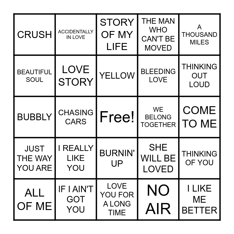 This bingo card has a free space and 47 words: LOVEBUG, I LIKE ME BETTER, ADORE YOU, LOVE YOU FOR A LONG TIME, I REALLY LIKE YOU, SUCKER, ACCIDENTALLY IN LOVE, NEVER LET YOU GO, BEAUTIFUL SOUL, WON'T GO HOME WITHOUT YOU, LOVE STORY, THE MAN WHO CAN'T BE MOVED, THINKING OF YOU, SHE WILL BE LOVED, YOU BELONG TO ME, THIS I PROMISE YOU, YELLOW, WE BELONG TOGETHER, YOU AND ME, A THOUSAND MILES, CHASING CARS, NO AIR, CRUSH, BLEEDING LOVE, YOUR BODY IS A WONDERLAND, THINKING OUT LOUD, ALL OF ME, A THOUSAND YEARS, BURNIN' UP, JUST THE WAY YOU ARE, STITCHES, WE FOUND LOVE, STAY WITH ME, SAY YOU WON'T LET GO, BETTER TOGETHER, IF I AIN'T GOT YOU, COME TO ME, YOU AND I, OPHELIA, PHOTOGRAPH, HEY, SOUL SISTER, STORY OF MY LIFE, BUBBLY, TEAM, LOVE SOMEBODY, SHAPE OF YOU and FIRST DATE.