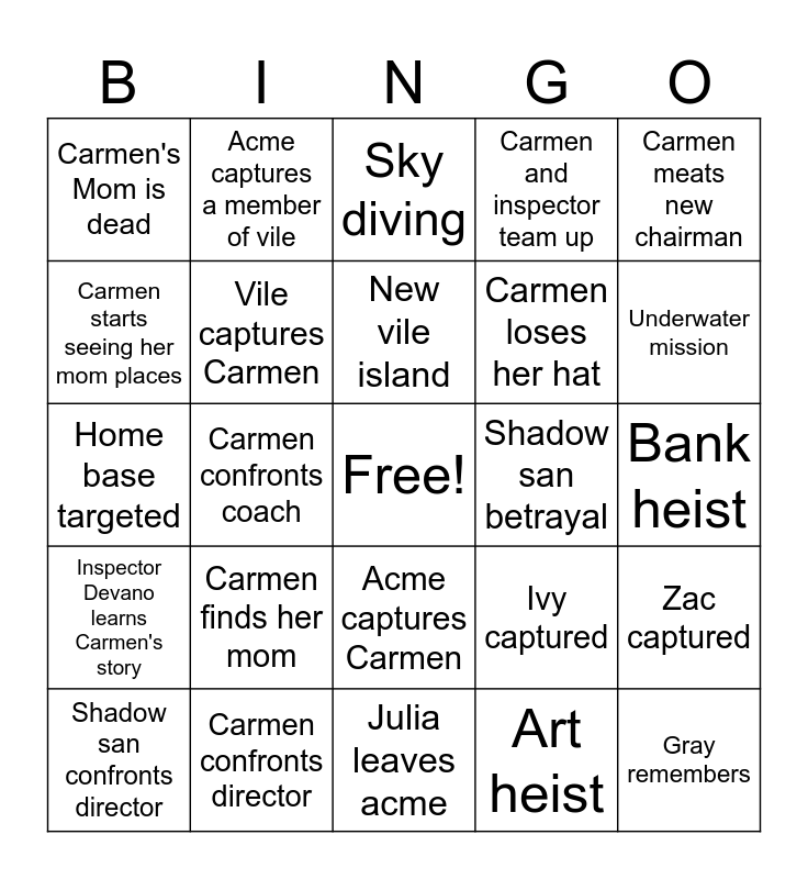 This bingo card has a free space and 24 words: Carmen finds her mom, Carmen confronts director, New vile island, Shadow san confronts director, Carmen meats new chairman, Carmen's Mom is dead, Carmen starts seeing her mom places, Acme captures a member of vile, Shadow san betrayal, Acme captures Carmen, Carmen loses her hat, Home base targeted, Ivy captured, Zac captured, Vile captures Carmen, Art heist, Bank heist, Sky diving, Underwater mission, Carmen confronts coach, Gray remembers, Inspector Devano learns Carmen's story, Carmen and inspector team up and Julia leaves acme.