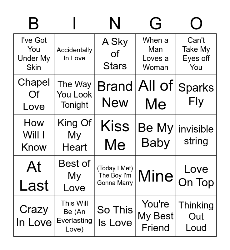 This bingo card has 62 words: Marry You, This Will Be (An Everlasting Love), Signed, Sealed, Delivered (I'm Yours), At Last, Thinking Out Loud, a thousand years, The Way You Look Tonight, Speechless, All of Me, Lover, When a Man Loves a Woman, Crazy for You, Chapel Of Love, All You Need Is Love, I Do, I Do, I Do, I Do, I Do, I've Got You Under My Skin, Kiss Me, Can't Take My Eyes off You, Something Just Like This, Brand New, Be My Baby, A Sky of Stars, Crazy In Love, You're My Best Friend, Ain't No Mountain High Enough, Everything, Love Train, Happy Together, Love On Top, Sugar, I Wanna Dance With Somebody, Paper Rings, Still Fallin' For You, What Makes You Beautiful, invisible string, Accidentally In Love, What A Man Gotta Do, Love Story, King Of My Heart, Steal My Girl, How Will I Know, Dancing In The Moonlight, Best of My Love, Anyone, Sparks Fly, Mine, You Are In Love, Then He Kissed Me, Just Like Heaven, Now That We Found Love, (Today I Met) The Boy I'm Gonna Marry, So This Is Love, You Send Me, A Sunday Kind Of Love, Today Was A Fairytale, Can't Help Falling in Love, Let's Stay Together, The Shoop Shoop Song, Marry Me- Dolly Parton, Wishin' And Hopin', I'm A Believer and I Love You Always Forever.