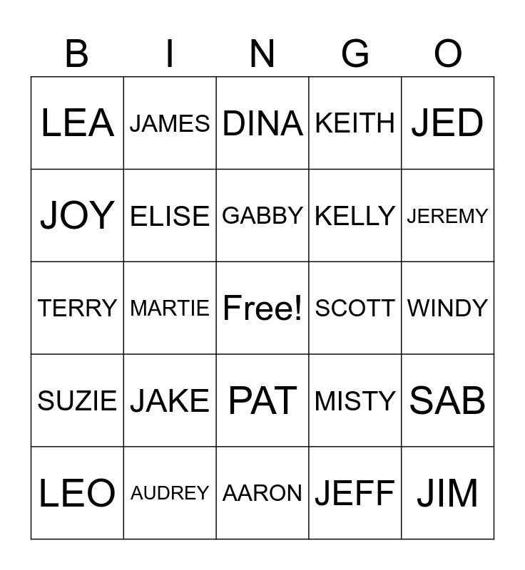 This bingo card has a free space and 28 words: SAB, JOAN, KELLY, JEFF, JOY, DINA, JAMES, SUZIE, SCOTT, LEO, TERRY, KEITH, AUDREY, AARON, JEREMY, JENNY, JAKE, ELISE, GABBY, PAT, LEA, DEAN, JIM, MARTIE, WINDY, MISTY, JED and SUNNY.