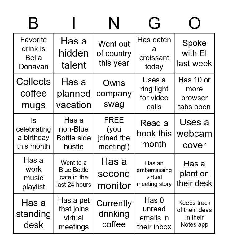 This bingo card has a free space and 24 words: Went to a Blue Bottle cafe in the last 24 hours, Has a pet that joins virtual meetings, Owns company swag, Has a standing desk, Spoke with El last week, Favorite drink is Bella Donavan, Collects coffee mugs, Has a hidden talent, Read a book this month, Has a second monitor, Uses a ring light for video calls, Is celebrating a birthday this month, Has an embarrassing virtual meeting story, Has a plant on their desk, Has a planned vacation, Has 0 unread emails in their inbox, Uses a webcam cover, Went out of country this year, Has 10 or more browser tabs open, Has a non-Blue Bottle side hustle, Keeps track of their ideas in their Notes app, Has a work music playlist, Has eaten a croissant today and Currently drinking coffee.