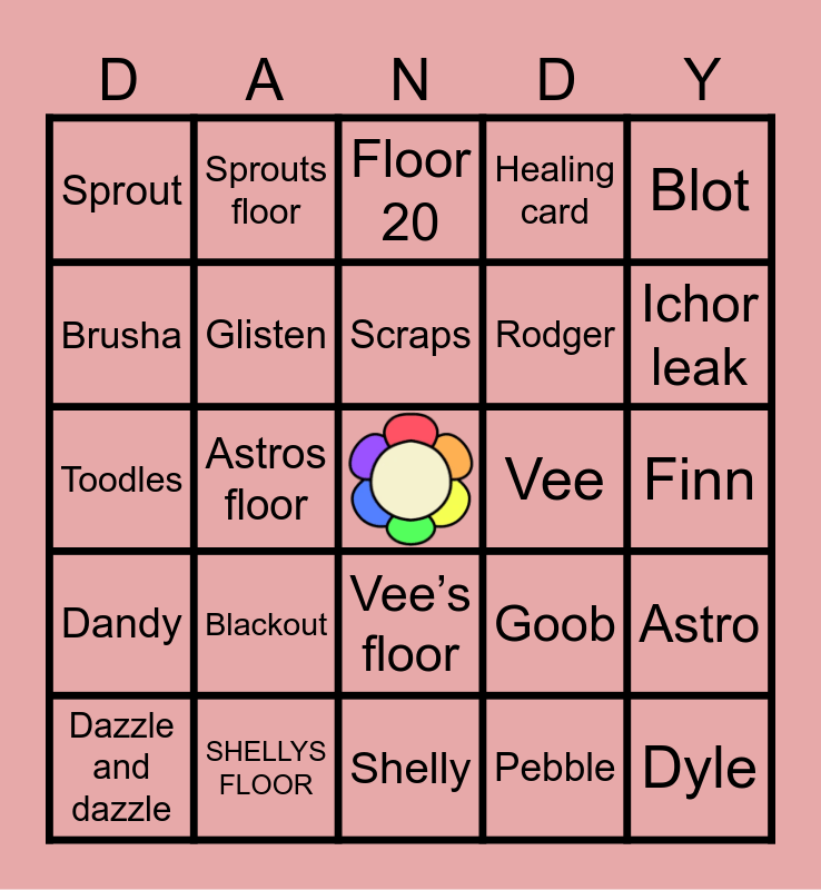 This bingo card has a free space and 24 words: Blackout, SHELLYS FLOOR, Scraps, Dazzle and dazzle, Blot, Sprout, Brusha, Sprouts floor, Vee, Vee’s floor, Rodger, Toodles, Goob, Astro, Glisten, Pebble, Finn, Floor 20, Ichor leak, Astros floor, Dyle, Dandy, Healing card and Shelly.