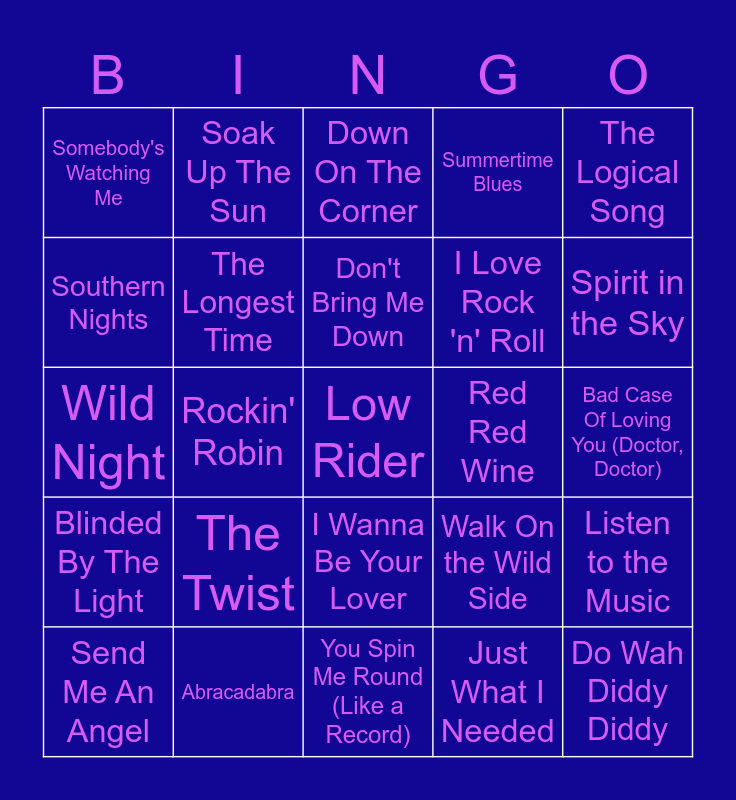 This bingo card has 47 words: Free!, Low Rider, Burnin' for You, You Spin Me Round (Like a Record), The Twist, Bennie And The Jets, Soak Up The Sun, December, 1963 (Oh What a Night!), Southern Nights, Johnny B. Goode, The Longest Time, Summertime Blues, Listen to the Music, Walk On the Wild Side, Sultans of Swing, I Love a Rainy Night, Don't Bring Me Down, Red Red Wine, Bang a Gong (Get It On), The Logical Song, Rockin' Robin, Just What I Needed, Somebody's Watching Me, I Love Rock 'n' Roll, All Right Now, Spirit in the Sky, Send Me An Angel, Let Your Love Flow, I Wanna Be Your Lover, Blinded By The Light, Louie Louie, Takin' Care Of Business, Two Tickets to Paradise, The Loco-Motion, Bang the Drum All Day, Abracadabra, Bad Case Of Loving You (Doctor, Doctor), Life Is A Highway, Wild Thing, Running on Empty, Do Wah Diddy Diddy, Down On The Corner, Wild Night, Got My Mind Set On You, Heartache Tonight, Love Shack and Boogie Shoes.