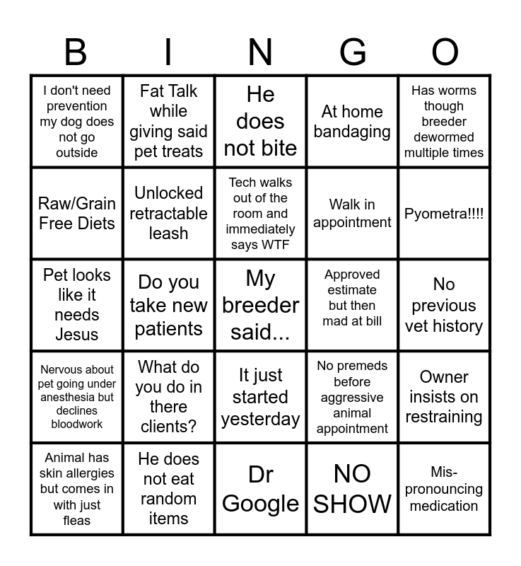 This bingo card has 30 words: He does not eat random items, Pet is sick but still wants nail trim, Do you take new patients, Can I ask about my other pet?, I don't need prevention my dog does not go outside, He does not bite, Unlocked retractable leash, It just started yesterday, Approved estimate but then mad at bill, Dr Google, No previous vet history, My breeder said..., NO SHOW, Mis-pronouncing medication, Pyometra!!!!, Came in to discuss allergy medicine -only picked OTC, No premeds before aggressive animal appointment, Nervous about pet going under anesthesia but declines bloodwork, What do you do in there clients?, Has worms though breeder dewormed multiple times, Pet looks like it needs Jesus, Foreign Body Doodle, Fat Talk while giving said pet treats, Walk in appointment, Raw/Grain Free Diets, At home bandaging, Owner insists on restraining, Animal has skin allergies but comes in with just fleas, Tech walks out of the room and immediately says WTF and Client calls more than once before clinic opens.
