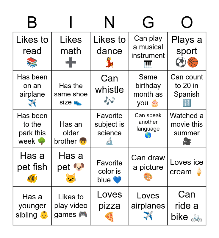 This bingo card has 25 words: Has a pet 🐶🐱, Loves pizza 🍕, Can whistle 🎶, Has a younger sibling 👶, Plays a sport ⚽🏀, Likes to read 📚, Has been on an airplane ✈️, Likes math ➕, Can speak another language 🌎, Favorite color is blue 💙, Same birthday month as you 🎂, Has been to the park this week 🌳, Can draw a picture 🎨, Loves ice cream 🍦, Has the same shoe size 👟, Can ride a bike 🚲, Watched a movie this summer 🎥, Likes to dance 💃, Can count to 20 in Spanish 🔢, Has an older brother 👦, Favorite subject is science 🔬, Likes to play video games 🎮, Has a pet fish 🐠, Can play a musical instrument 🎹 and Loves airplanes ✈️.