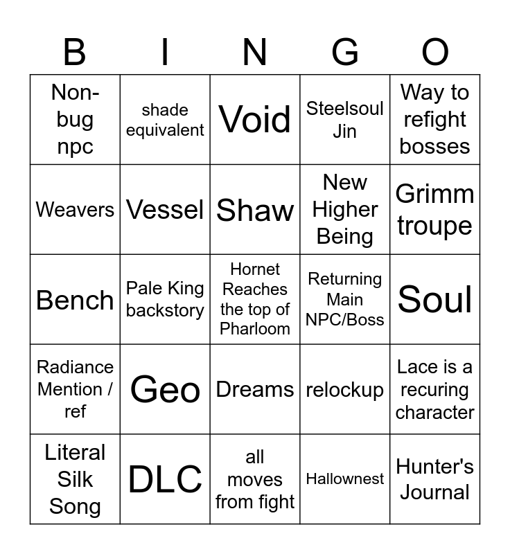 This bingo card has a free space and 24 words: Geo, DLC, Shaw, Literal Silk Song, Way to refight bosses, Non-bug npc, Weavers, shade equivalent, Returning Main NPC/Boss, Dreams, New Higher Being, Bench, relockup, Lace is a recuring character, Vessel, Hallownest, Soul, Void, Grimm troupe, Pale King backstory, Hunter's Journal, Radiance Mention / ref, Steelsoul Jin and all moves from fight.
