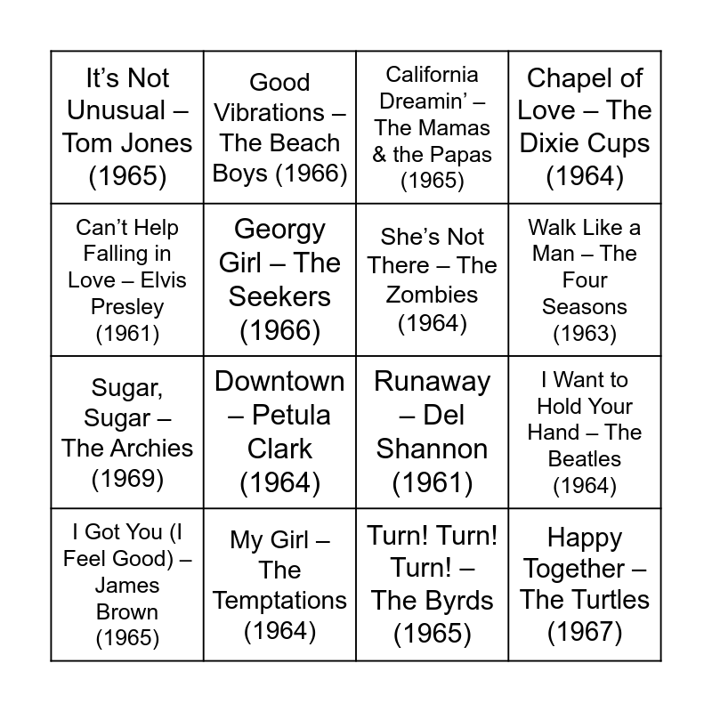 This bingo card has 20 words: I Want to Hold Your Hand – The Beatles (1964), Be My Baby – The Ronettes (1963), California Dreamin’ – The Mamas & the Papas (1965), These Boots Are Made for Walkin’ – Nancy Sinatra (1966), I Got You (I Feel Good) – James Brown (1965), Can’t Help Falling in Love – Elvis Presley (1961), My Girl – The Temptations (1964), It’s Not Unusual – Tom Jones (1965), Sugar, Sugar – The Archies (1969), Good Vibrations – The Beach Boys (1966), Downtown – Petula Clark (1964), Runaway – Del Shannon (1961), Georgy Girl – The Seekers (1966), Happy Together – The Turtles (1967), She’s Not There – The Zombies (1964), The Twist – Chubby Checker (1960), Walk Like a Man – The Four Seasons (1963), Chapel of Love – The Dixie Cups (1964), Turn! Turn! Turn! – The Byrds (1965) and Aquarius/Let the Sunshine In – The 5th Dimension (1969.