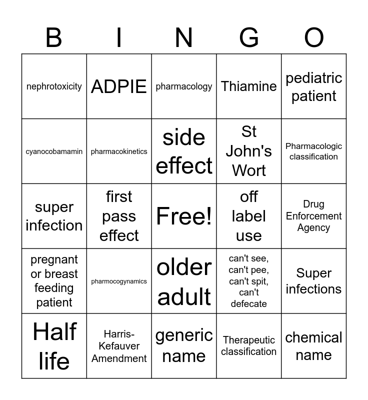 This bingo card has a free space and 29 words: Half life, agonist, first pass effect, antagonist, nephrotoxicity, pharmacology, pharmacokinetics, pharmocogynamics, off label use, Harris-Kefauver Amendment, Drug Enforcement Agency, chemical name, generic name, Therapeutic classification, Pharmacologic classification, grapefruit, older adult, pregnant or breast feeding patient, pediatric patient, super infection, can't see, can't pee, can't spit, can't defecate, Physicians Desk Reference, St John's Wort, cyanocobamamin, Thiamine, ADPIE, Super infections, side effect and allergic reaction.