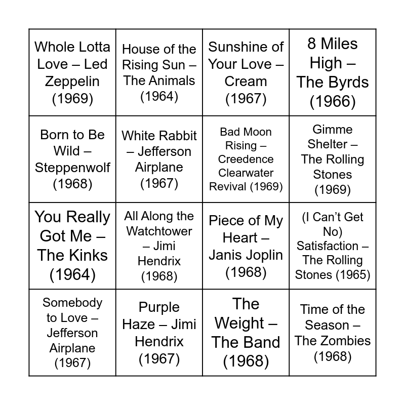 This bingo card has 20 words: (I Can’t Get No) Satisfaction – The Rolling Stones (1965), Light My Fire – The Doors (1967), Sunshine of Your Love – Cream (1967), Fortunate Son – Creedence Clearwater Revival (1969), Somebody to Love – Jefferson Airplane (1967), Born to Be Wild – Steppenwolf (1968), Purple Haze – Jimi Hendrix (1967), Whole Lotta Love – Led Zeppelin (1969), You Really Got Me – The Kinks (1964), House of the Rising Sun – The Animals (1964), All Along the Watchtower – Jimi Hendrix (1968), Piece of My Heart – Janis Joplin (1968), White Rabbit – Jefferson Airplane (1967), Time of the Season – The Zombies (1968), Bad Moon Rising – Creedence Clearwater Revival (1969), In-A-Gadda-Da-Vida – Iron Butterfly (1968), Gimme Shelter – The Rolling Stones (1969), 8 Miles High – The Byrds (1966), The Weight – The Band (1968) and Sunshine Superman – Donovan (1966).