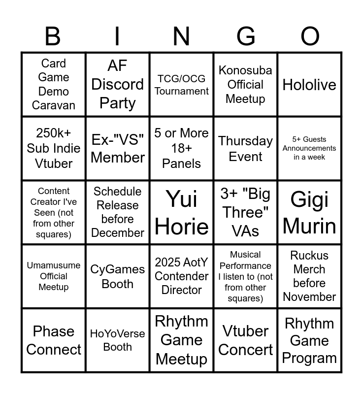 This bingo card has a free space and 24 words: CyGames Booth, HoYoVerse Booth, 5 or More 18+ Panels, Phase Connect, Hololive, Card Game Demo Caravan, 250k+ Sub Indie Vtuber, AF Discord Party, 3+ "Big Three" VAs, 2025 AotY Contender Director, Thursday Event, Content Creator I've Seen (not from other squares), Musical Performance I listen to (not from other squares), Ruckus Merch before November, Ex-"VS" Member, Vtuber Concert, Gigi Murin, TCG/OCG Tournament, 5+ Guests Announcements in a week, Schedule Release before December, Rhythm Game Program, Umamusume Official Meetup, Konosuba Official Meetup and Rhythm Game Meetup.