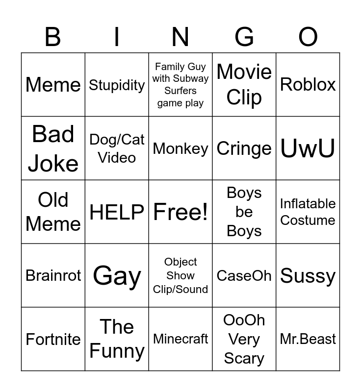 This bingo card has a free space and 24 words: Gay, The Funny, Monkey, Fortnite, Roblox, Meme, Bad Joke, Stupidity, Boys be Boys, Object Show Clip/Sound, Cringe, Old Meme, CaseOh, Sussy, Dog/Cat Video, OoOh Very Scary, Inflatable Costume, Family Guy with Subway Surfers game play, UwU, HELP, Mr.Beast, Brainrot, Movie Clip and Minecraft.